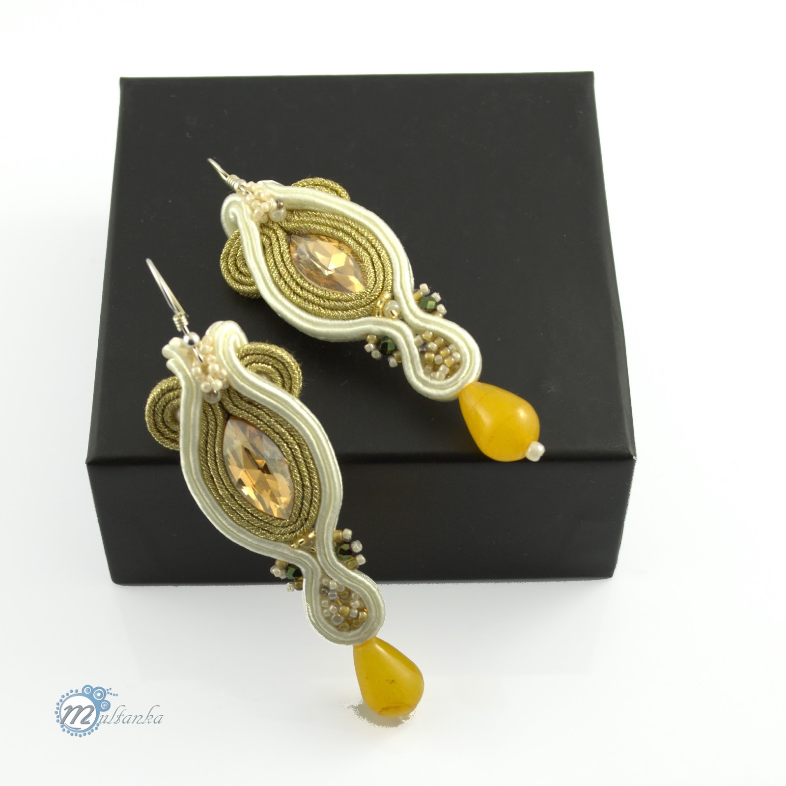 A dziś dla odmiany drobiazgi. Smukłe sutaszowe kolczyki ze szklanymi kryształkami i jadeitami. Wszystko w odcieniach szampana i złota:)